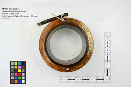 Wednesday has been a good day for Worthington disassembly for the last couple of weeks! Last Wednesday, Gary, Eric and Will used a hydraulic press and a new tool made from recycled aluminum to press out the brass cylinder liners and iron retaining rings from both port and starboard Worthington pumps.