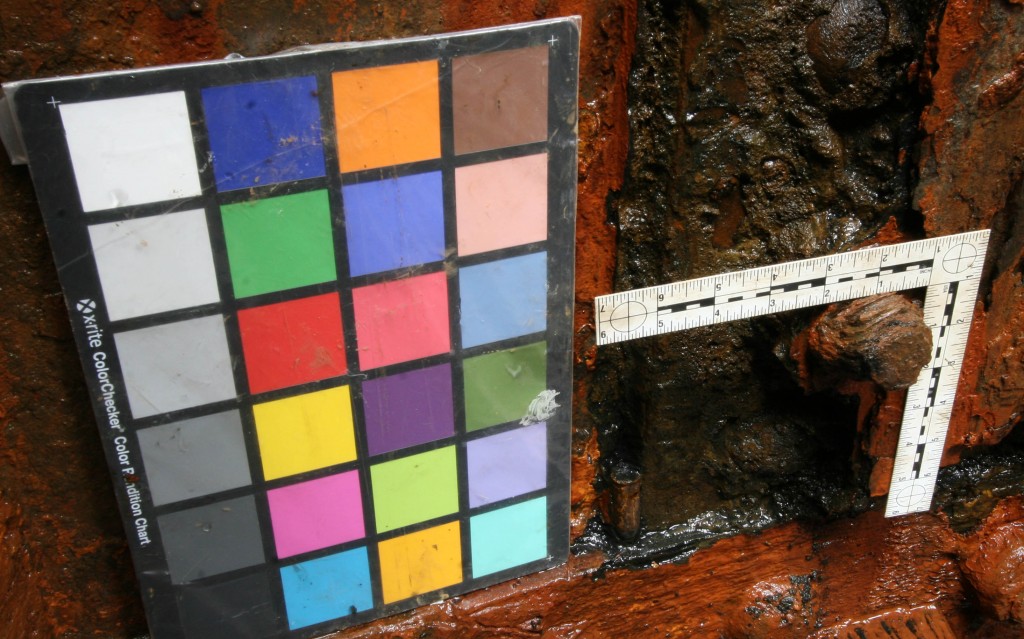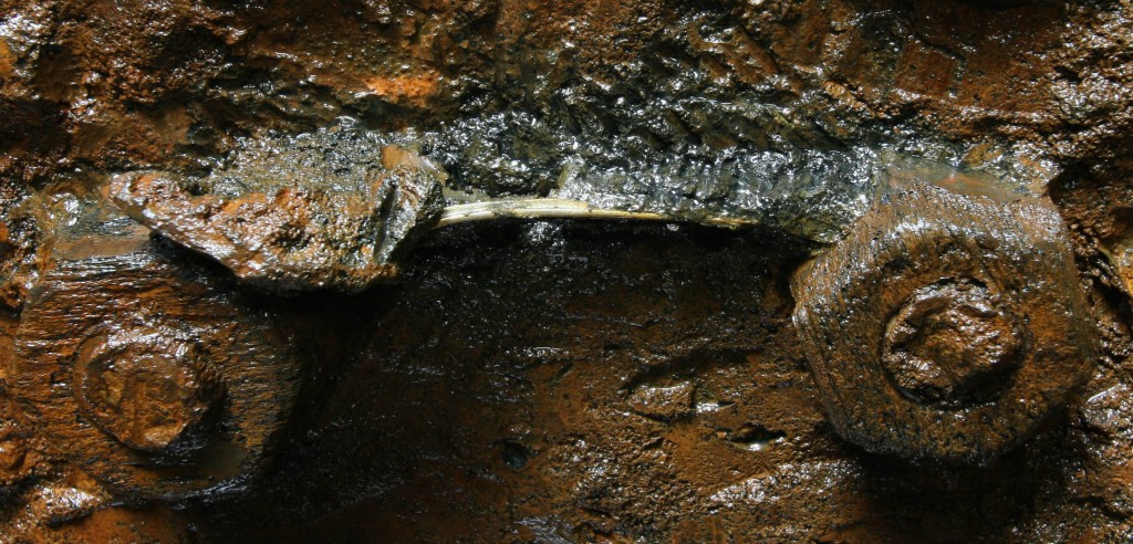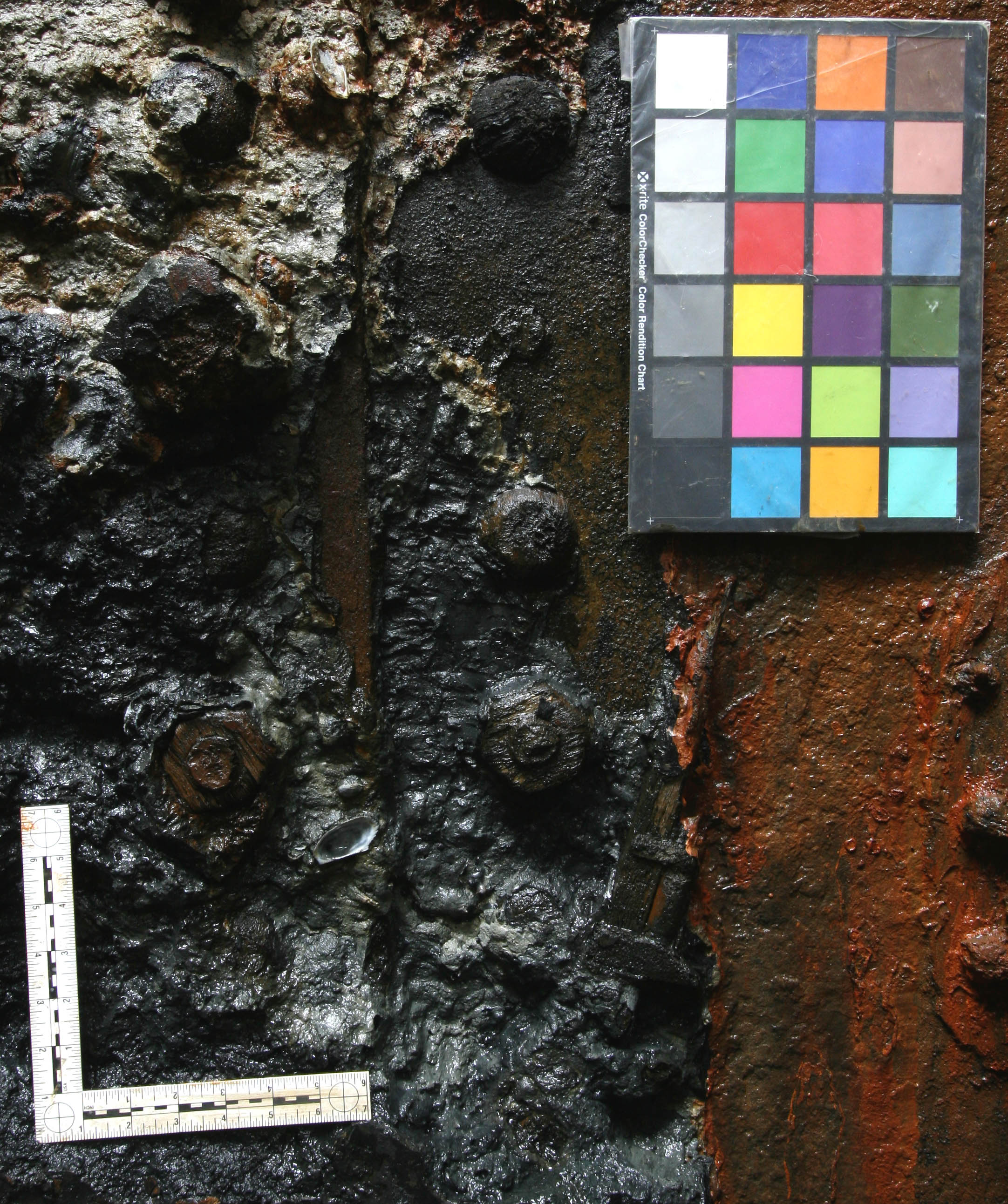 As concretion removal on the turret has continued, a host of new finds have been discovered!!! The focus of concretion removal has shifted around a bit during the last several weeks (look at previous blog posts). We began work with the documentation and removal of the roof stanchions, which then moved to the excavation of concretion between the roof rails and beams, and currently to the removal of corrosion and concretion in and around the nutguards.