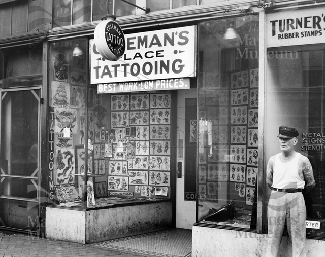 我们有来自Coleman的其他物品,包括纹身针,针对针,各种瓶子和其他一些纹身设计/模板的电池。一个悲伤的故事,这个系列是由珀西沃尔特斯制成的电动针之一的盗窃,并由科尔曼在30年代使用。1999年,它从我们的展览皮肤深处展示的地方被盗:纹身的艺术。员工非常令人不安,令人痛苦地发现它缺失,我们仍然希望有一天它可能会表面。下面是一张照片。