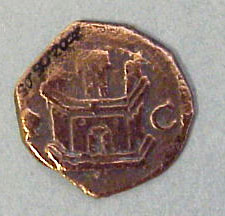 这两张照片展示的是一枚1马拉维迪斯硬币,大约在1558-1576年,产自西班牙昆卡。一边是王冠上的字母组合国王菲利普二世.另一边是高耸的城堡图像,上面有塔楼和字母“C”。城堡左边似乎有一个圣杯,但很难说。