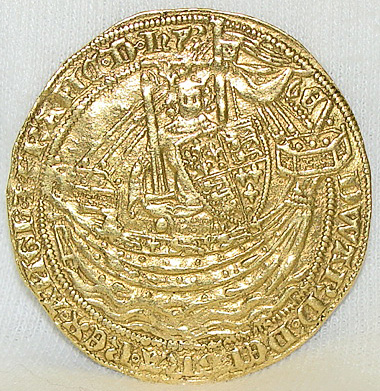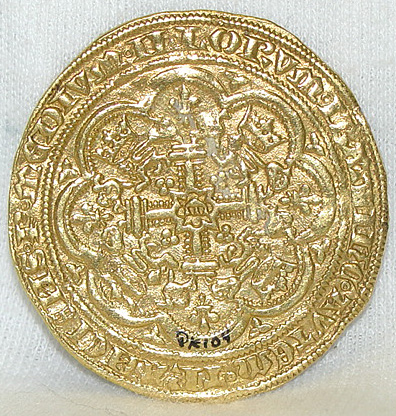 上面是一枚金币(约1361-1369年),纪念爱德华三世国王和瓦卢瓦的菲利普之间的斯路易斯战役。中央图像显示国王手持剑和盾站在船上。波浪在船下流动,图片被拉丁文文字包围着。背面显示的是一个被王冠包围的十字架,在外围又被拉丁文字包围。它非常漂亮,考虑到它的历史,它的形状非常惊人。