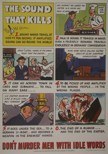 这些前三名海报是来自第二次世界大战的一些戏剧性的一些。左边的那个是从1942年起,鼓励人们通过表明它将有助于将孩子们安全免受纳粹的安全性来购买战争债券。海报上的颜色,尤其是绿色,使其非常有吸引力和引人注目,这就是为什么我非常喜欢它。中间人试图清楚地明确说出太多,包括死亡,可能会有严重的后果。还有另一个海报,具有相同的消息,可以在他的枪旁边具有一个大规模堕落士兵的手臂。第三张海报与第二个海报相同,并具有由于某人的疏忽而燃烧的船只。我所采取的图片还可以,但是看到海报的人更令人印象深刻。