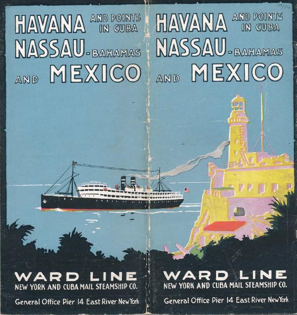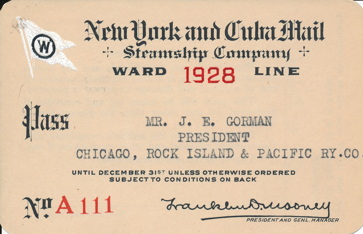 这里有一张1928年纽约和古巴邮船公司的通行证和一本小册子。