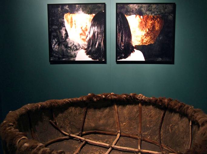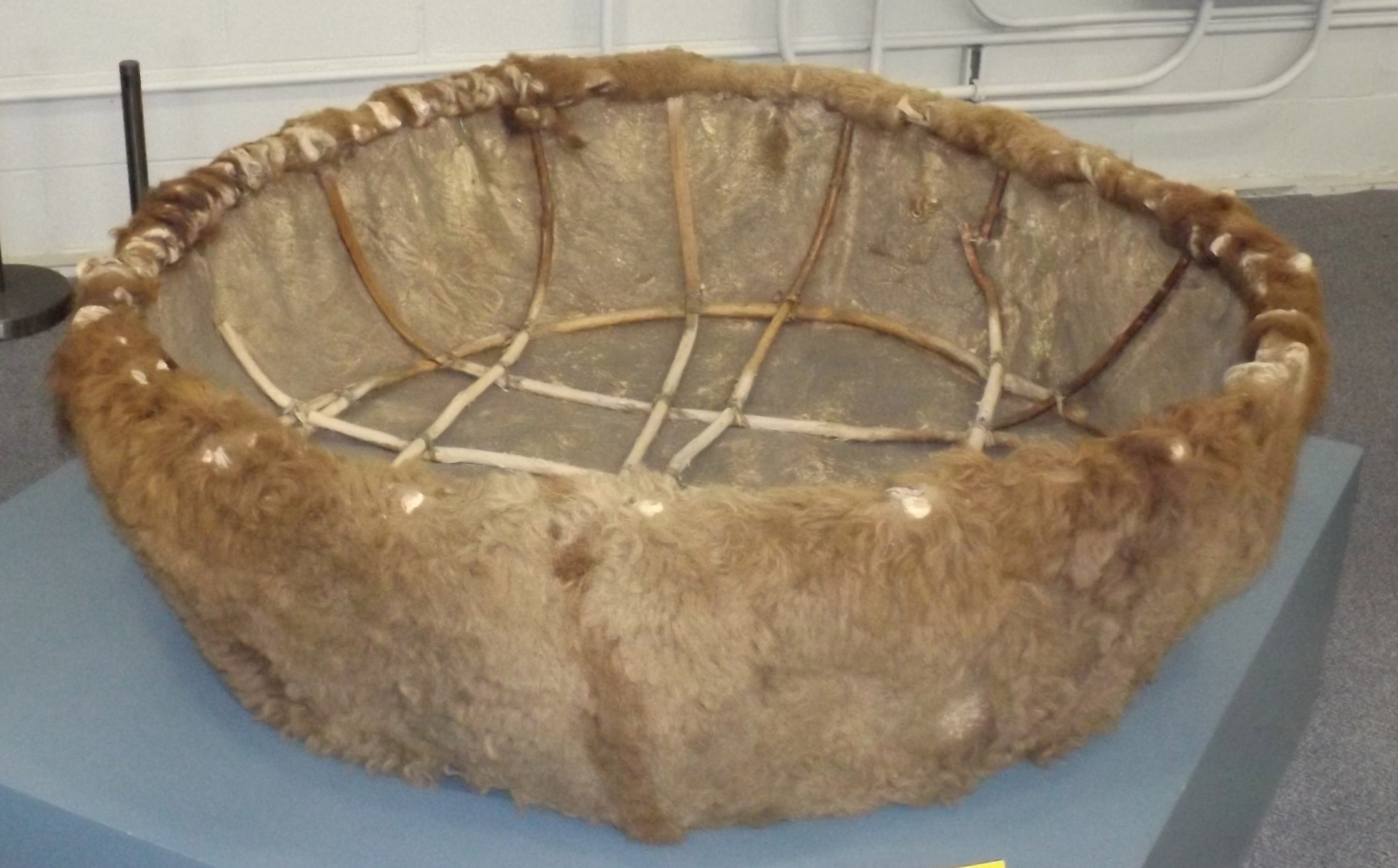 This particular bull boat was built specifically for the museum in the 30’s when we were searching for boats to help round out our small craft collection. We hired Crows Heart of the Hidatsa Nation at Fort Berthold Reservation in North Dakota, who had built these boats for others and was an expert at doing so. We managed to obtain a buffalo hide from Canada Packers Co. in Toronto and had it shipped to the reservation.