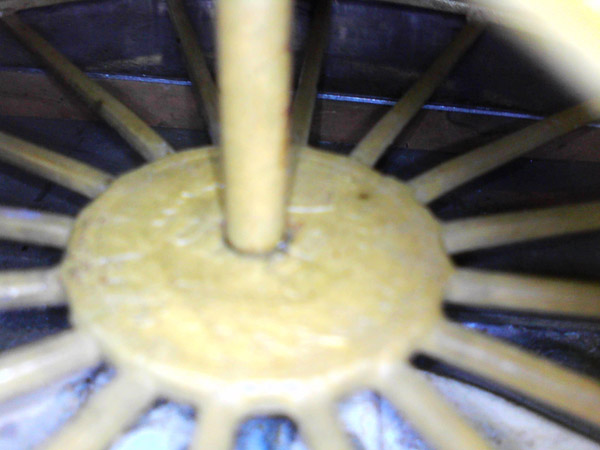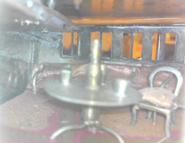 The cabins weren’t the only surprises waiting for us. Upon researching the model, I discovered an article that mentioned pennies from 1863/1864 being used for the axles in the paddlewheels. I pulled out my flashlight and, sure enough, there they were! Unfortunately they are very difficult to photograph, so I have the two photos showing one of the pennies and then what little text I could get to show up.