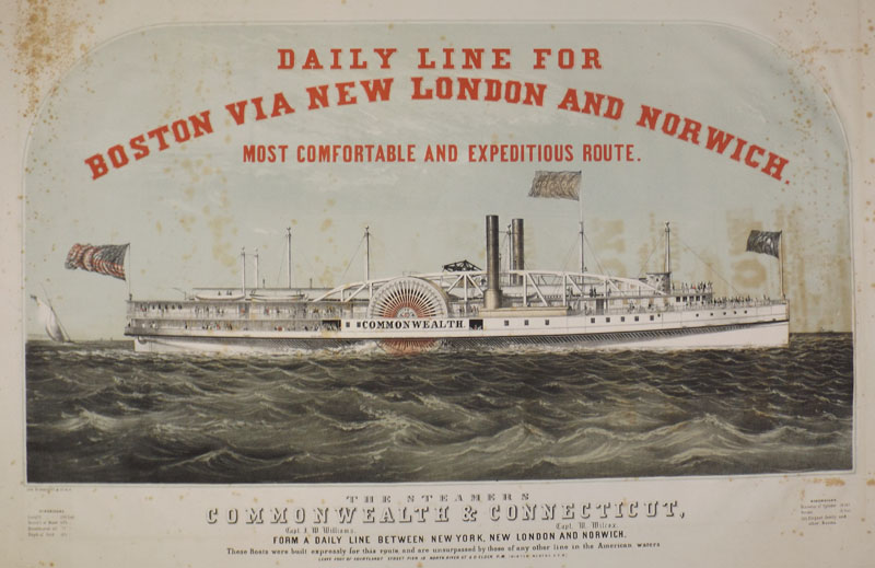 Commonwealthwas built in 1854-1855 by Lawrence & Foulkes in Greenpoint, Long Island, NY for the Norwich and New London Steamboat Company. She was built for service between New York and Connecticut, and was commanded by Captain Jerome Wheeler Williams until 1864. In 1860 she was acquired by the Stonington Line, and then by the Merchants Navigation and Transportation Company in 1863. December 29, 1865, a fire at the wharf whereCommonwealthwas docked caused the ship to be destroyed by flames.