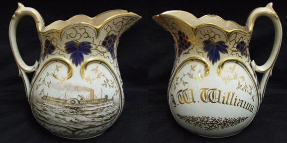 The model was built ca 1863/1864 by John Dean Benton, a silversmith with Tiffany & Co. It is made of gold and silver and houses a music box that plays ten tunes of the 1860’s, including ‘By Banks and Braes of Bonnie Doon’ and ‘Nellie Bly’. While playing the music, the paddlewheels and walking beam engine move. It was exhibited in the 1867 Exposition Universelle in Paris where it, along with other items from Tiffany & Co., won bronze medal. It was also quite damaged at this exposition with many of the pieces on top having been broken off and stolen. It was repaired upon return to the US by Denton himself.