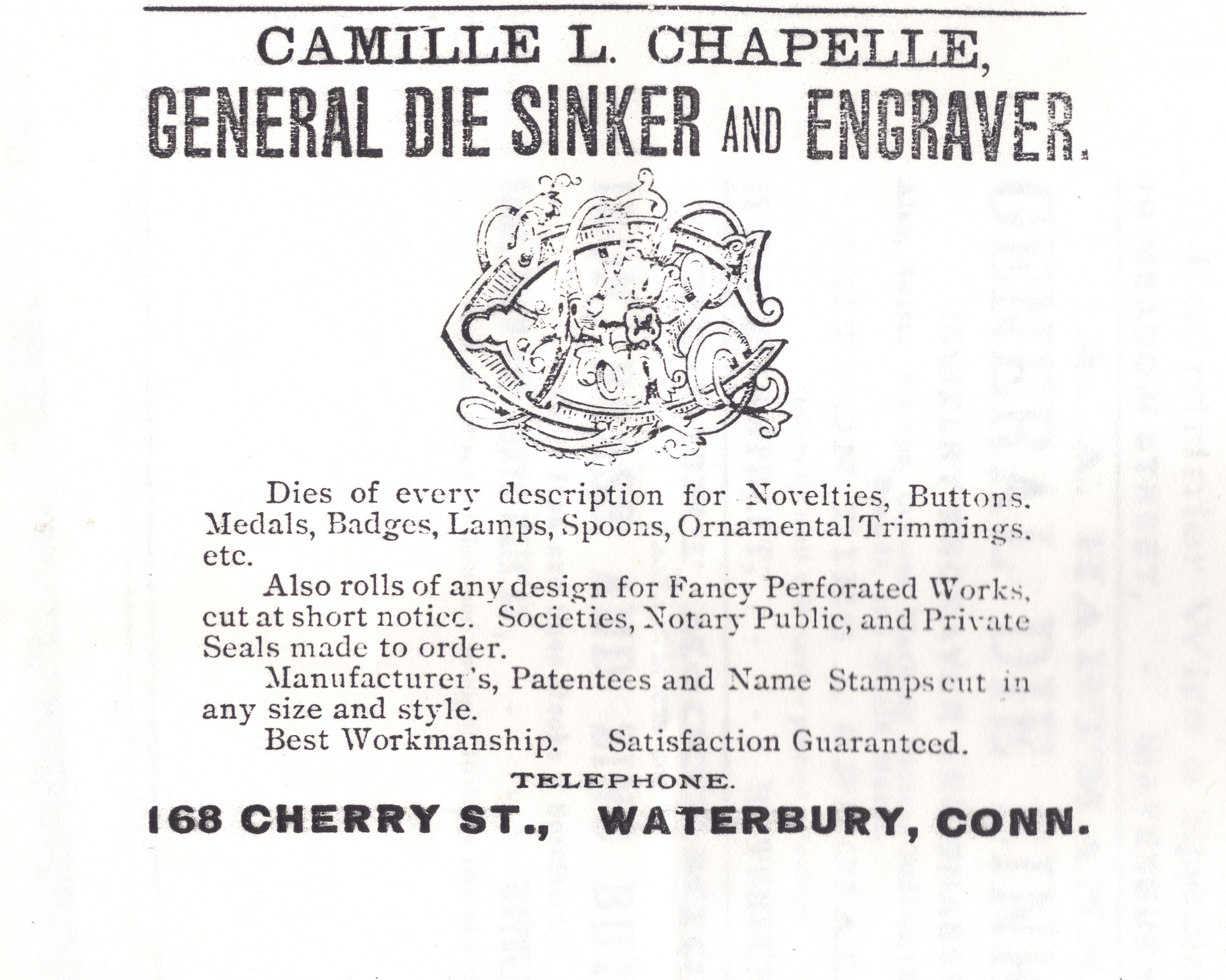 Button die with anchor design and S c S in center. If anyone knows what this button might have been for, please let me know. This one was cut by Camille L. Chapelle, who was listed in the Waterbury city directories from 1895 to 1922. Below is his ad from 1895.
