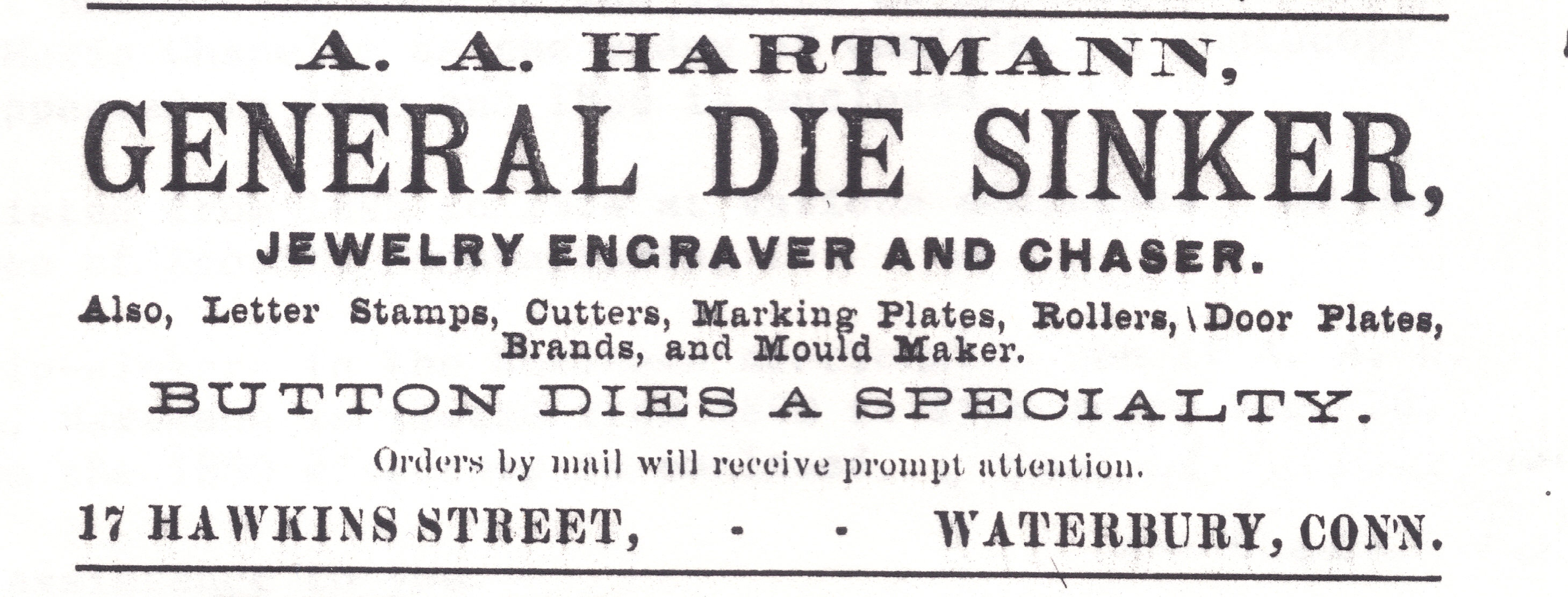 American Yacht Club die, cut by Adolph A. Hartmann, who was listed in the Waterbury city directories from 1890 to 1926, when he died. Below is an advertisement from 1890.