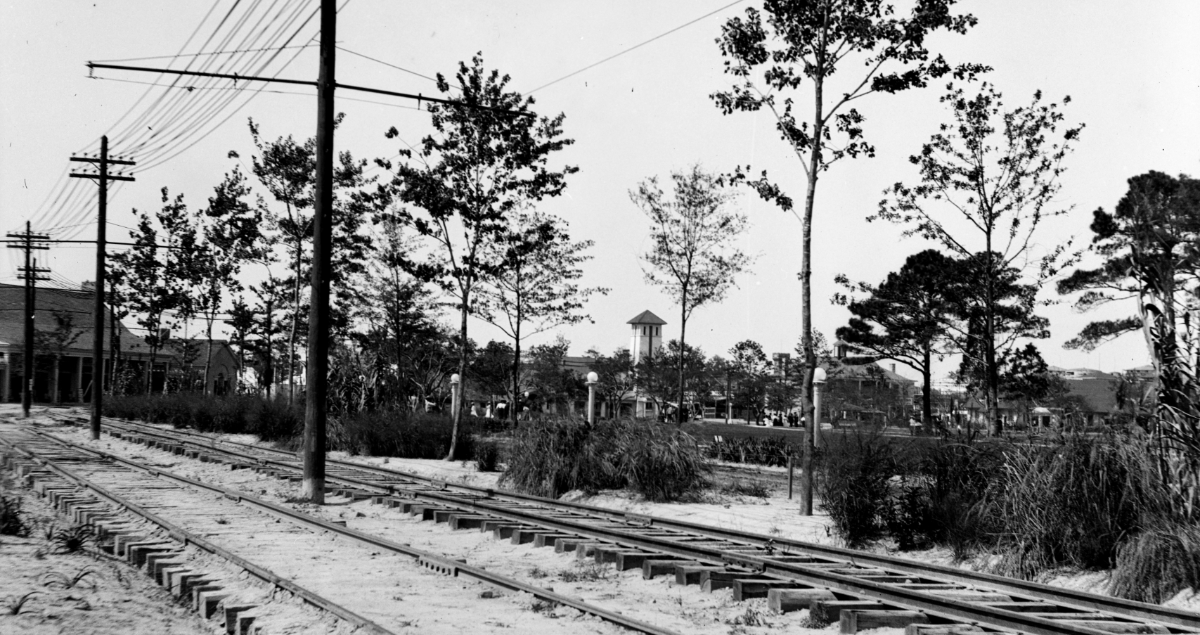 Other tourists came on the train from downtown Norfolk, providing Hungerford with the opportunity to frame Exposition buildings with one of his favorite subjects: railroad tracks.