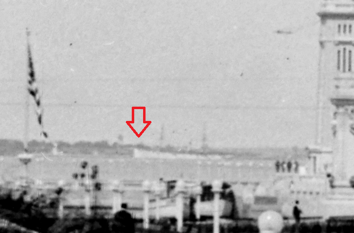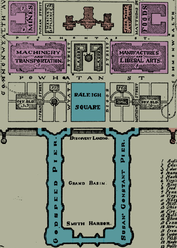 Based on theHampton Roads Naval Museum’soutstanding online exhibit about the Exposition we can determine Hungerford’s location when making the shots above. Referencing a map of the grounds, a detail of which is excerpted below, Hungerford was probably standing on the steps of the auditorium near the middle of Pocahontas Street. The structure with columns and flags on the right is the Palace of Transportation and Machinery. Beyond this, in the middle of the panorama, is the Government Building. The left half of the image shows the lagoon and Raleigh Square with the pier in the distance.