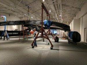 因为我们不得不拿起严厉的横梁和密苏里州ve it about ten feet to get it into position we used our gantries. This meant having to disassemble them afterwards but using chain falls severely hampered our maneuverability. We lifted the crossbeam and moved it as close as possible to its final seated position. At that point I crawled into the hulls and loosened the bolts at each end of the forward crossbeam. This allowed us to lift the aft end of the central pod about a foot or two and the forward crossbeam about six inches (we didn’t want to raise it too far because we didn’t want the hulls shift position and misalign the connection points). Then, with five people working together (two operating chain falls on the forward crossbeam, one on the chain fall at the aft end of the central pod and two on the gantry chain falls) we slowly tucked the crossbeam into the back of the central pod and gently lowered all three pieces onto the hulls.