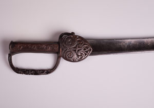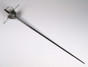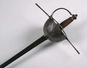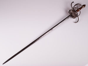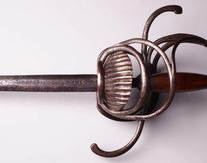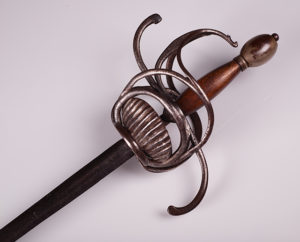 第三个是一个复合西班牙cup-hilt剑杆,the slender blade with central fuller on both sides at the forte stamped with an inscription, iron hilt with deep cup chiselled in low relief with double-headed displayed eagles under an arcade, the upper edge bordered by a ring linked to the slender knuckle-guard and long straight quillons, rosette-shaped guardapolva, comprossed globular pommel, and copper wire bound grip. Late seventeenth century. It has a German blade, which we were able to discover after doing some research and sorting out what the inscription (which is on both sides of the forte) said. It is marked on one side “xx HEINRICH xx BRABENDER xx” and “xx MEFECIT xx SOLINGEN xx”. This means that Heinrich Brabender made this sword in Solingen, Germany, a city known for its blade-making. Neat thing to discover!