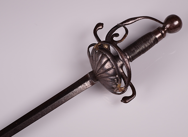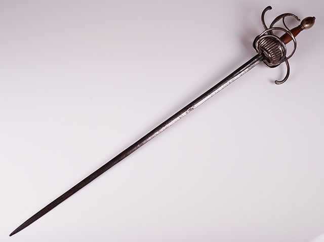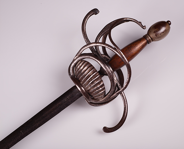 第一个是带有锥形刀片的复合杆,铁刀片,包括垂直弯曲的奎林,手臂和一对不对称的贝壳,由双环,指节守卫,球形鞍和后来的木制手柄框起来,CA 1600。它的起源是未知的,我们还没有找到任何标记来给我们任何线索。