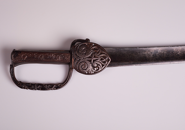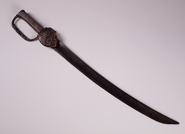 我们的第四篇是17世纪的西班牙海军衣架剑;铁护卫队和奎隆(Quillon)配上侧卫;蚀刻和凿子高度浮雕;铁板在握把和指关节弓的两侧;铁板平行于刀片,指向尖端。心脏装饰非常可爱。不幸的是,我们也没有在这件作品上找到任何标记。