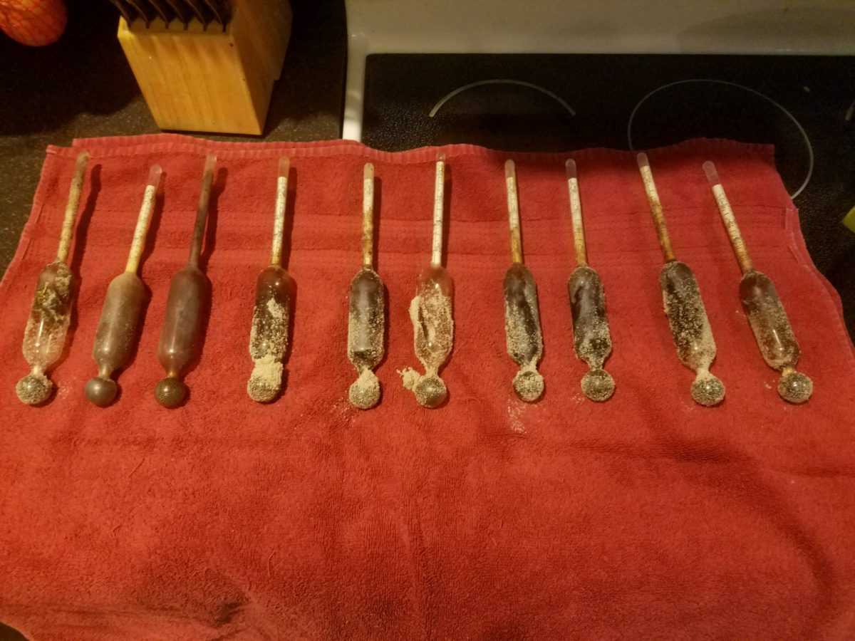 Last fall, the Slominski and Lawton families of Garner, North Carolina were vacationing in a remote area of Cape Lookout National Seashore when they noticed small objects bobbing in the surf. They collected a few of the items, and for roughly thirty minutes many more examples of the same item continued to float by. Not knowing what they were, they limited their collecting to about fifteen pieces. The items gathered were delicate glass tubes with a thin tube at the top containing a graduated paper scale, with a larger air-filled chamber at the middle, and a small bulb at the bottom filled with little lead pellets held in place by a cotton plug.
