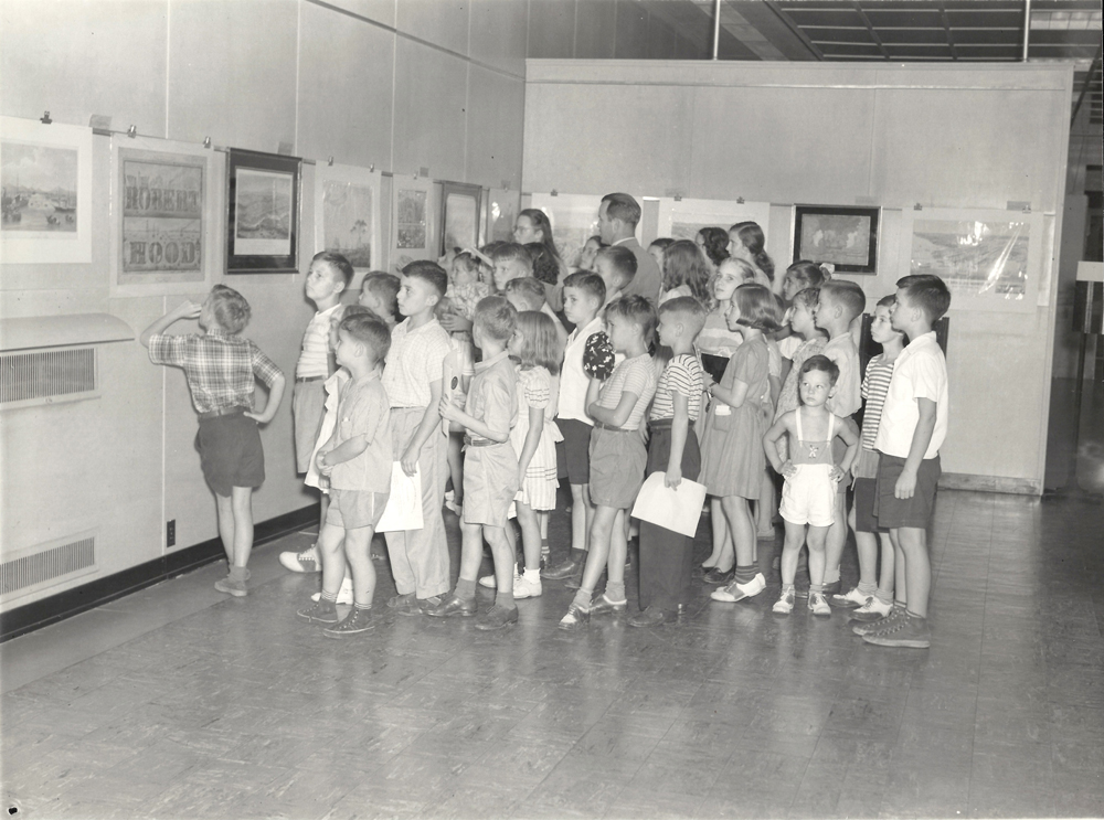 1947年9月3日,一群孩子因参观博物馆而参加图书馆度假阅读计划而获得奖励。显然,前面的小男孩对这次访问并不感到兴奋,他看上去很无聊。哈哈!左边的另一个男孩正在深入研究我们的罗伯特·胡德水彩,这是一个非常有趣的作品。这些字母是通过使用图像的人员或其他方面创建的。