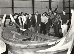 1975年的这张照片显示了我们的小型手工艺策展人克利福德·汉考克(Clifford Hancock)(在中央带领带和夹克)看着一艘与一群游客的船。我无法说出他们在看什么,因为我们的仰光Sampan(目前在存储中)将其封锁。在男人的后面是我们的莫莱西罗船,来自Portual,可以在我们的国际小型手工艺中心看到。