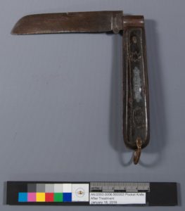 Conservator Paige Schmidt brought me a question about an object she was treating. She wanted to know whether the handle of this knife (see image below) was made from baleen. So I started the process of chemical analysis.