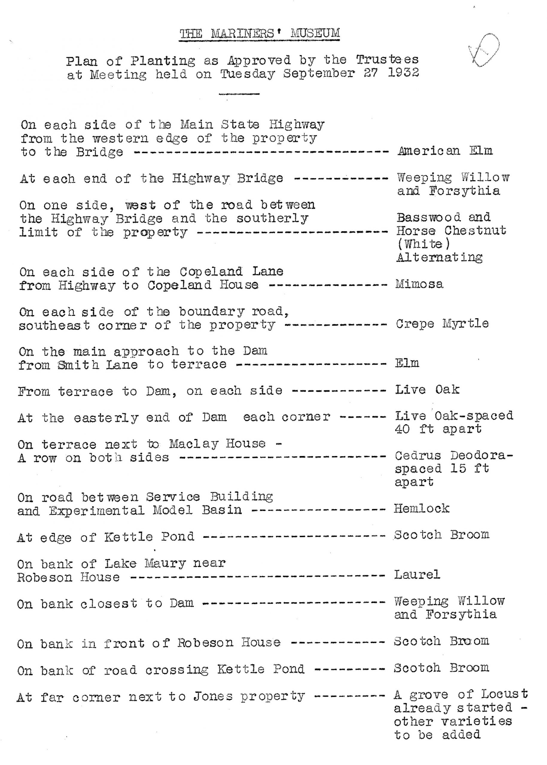 在公园内发现的所有树木和灌木,梅森对收到正式的学位和规划景观。到1932年夏天,他准备担任博物馆的角色。到9月,受托人委员会同意了公园的第一个官方种植计划。