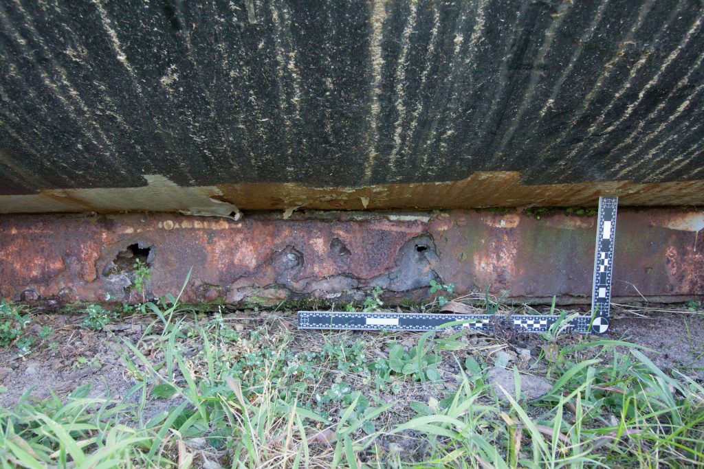 条件报告也是一个时间戳。报告和照片显示了龙骨在移动之前的样子,以防它在运输过程中发生变化。我们会尽我们所能阻止这一切,但我们的海洋考古学家汉娜挖掘的一个测试坑证实了我们的猜测,龙骨的底板由于与地面接触时间过长而变得很薄,而且碎片累累。部分埋藏意味着铁与泥土中的水、矿物质、氧气和微生物相互作用,导致腐蚀。这一过程会因金属在海洋中生活所留下的氯化物而加剧。龙骨的末端向上弯曲,不要触地。这些地区保存得很好。我们的重点是在电梯的中间部分。一旦潜艇进入新的摇篮,龙骨就会被足够的空气支撑以减缓腐蚀,直到我们能稳定它。