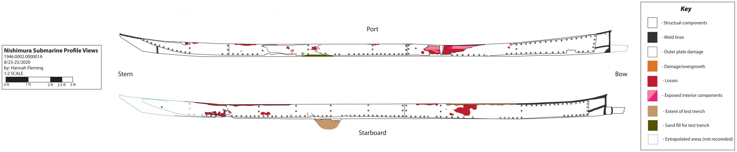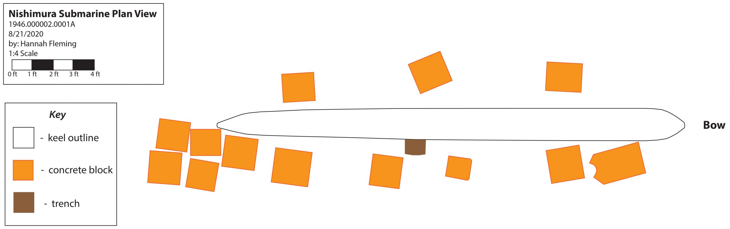 考古学家使用几种绘图和绘图技术来记录地点和文物。潜艇是一个有趣的挑战,因为它是一个单一的人工制品(这通常需要一个科学的图纸,如下面所示),但它是一个非常大的人工制品,实际上是一整个容器,所以我们质疑是否需要做一个场地平面图来代替。