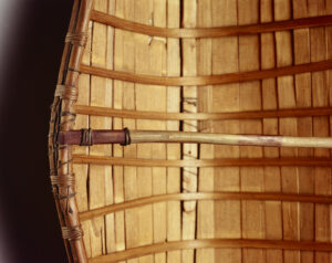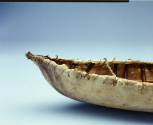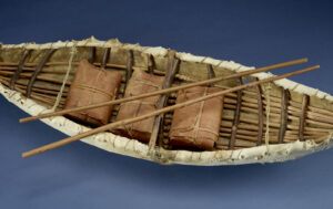 The Maliseet included three different types of canoes in their culture: birch bark, canvas, and moose hide. Canvas would have been adopted after contact with the Europeans. This model is actually constructed from deer hide, as Adney found it was easier to work with because it wasn’t as bulky as moose hide would have been. Rawhide was used for attaching the hide to the gunwales. This model is 32” long, 10” wide, and 6” deep. On the actual canoes, the hide was “frost tanned” using soap and water, freezing, and scraping while frozen.