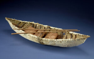 Adney’s model of a Tête de Boule canoe showcases the type of birch bark canoe that the Tête de Boule people used in their daily lives and constructed for French fur traders at the height of the fur trade in North America. Similar to the Athabascan people, the Tête de Boule lived in an area where they had access to superior birch bark. This, in combination with the high demand for canoes from French fur traders, meant that many of the Tête de Boule were experts in the construction of birch bark canoes.