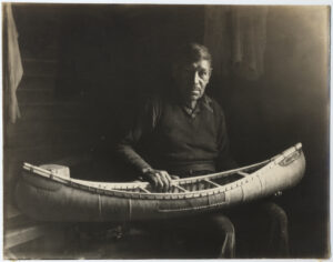 Welcome to one of the Interpretation Department’s obsessions! The Edwin Tappan Adney collection at The Mariners’ Museum and Park include 120 canoe models. Adney lived from 1868-1950. He was from the United States but fell in love with canoes when he was on vacation in Canada at the age of 19. For Adney, building canoe models was not a hobby. He felt that it was his duty to document as many of the boats as he could. The models were made ¼ sized and sometimes ⅕ sized. He learned some of the building methods from Native builders. For example, Frank Atwin, Passamaquoddy, was one of his teachers. This is an outstanding photograph, showing the size of the models.