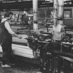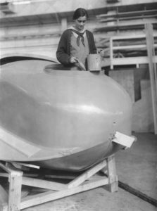 Here, a “girl” is in the process of painting a flying boat, the Curtiss Model F-5-L. The NAF’s assembly line approach increased efficiency dramatically.
