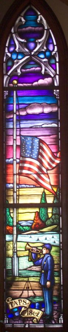 你们中的一些人可能看过这个彩色玻璃window in the Chapel of the Centurion at Fort Monroe. It depicts the playing of “Taps” in 1862. It is a beautiful window, but the first time I saw it I could not understand why it was there. Fort Monroe seems a long way from Harrison’s Landing. I discovered that John Tidball became Commander of the Artillery School at Fort Monroe in 1883 and served there until 1889. The Chapel had been completed in 1858, but several stained-glass windows were designed as part of the centennial celebration in 1958. The commemoration of the playing of “Taps” was one of them.