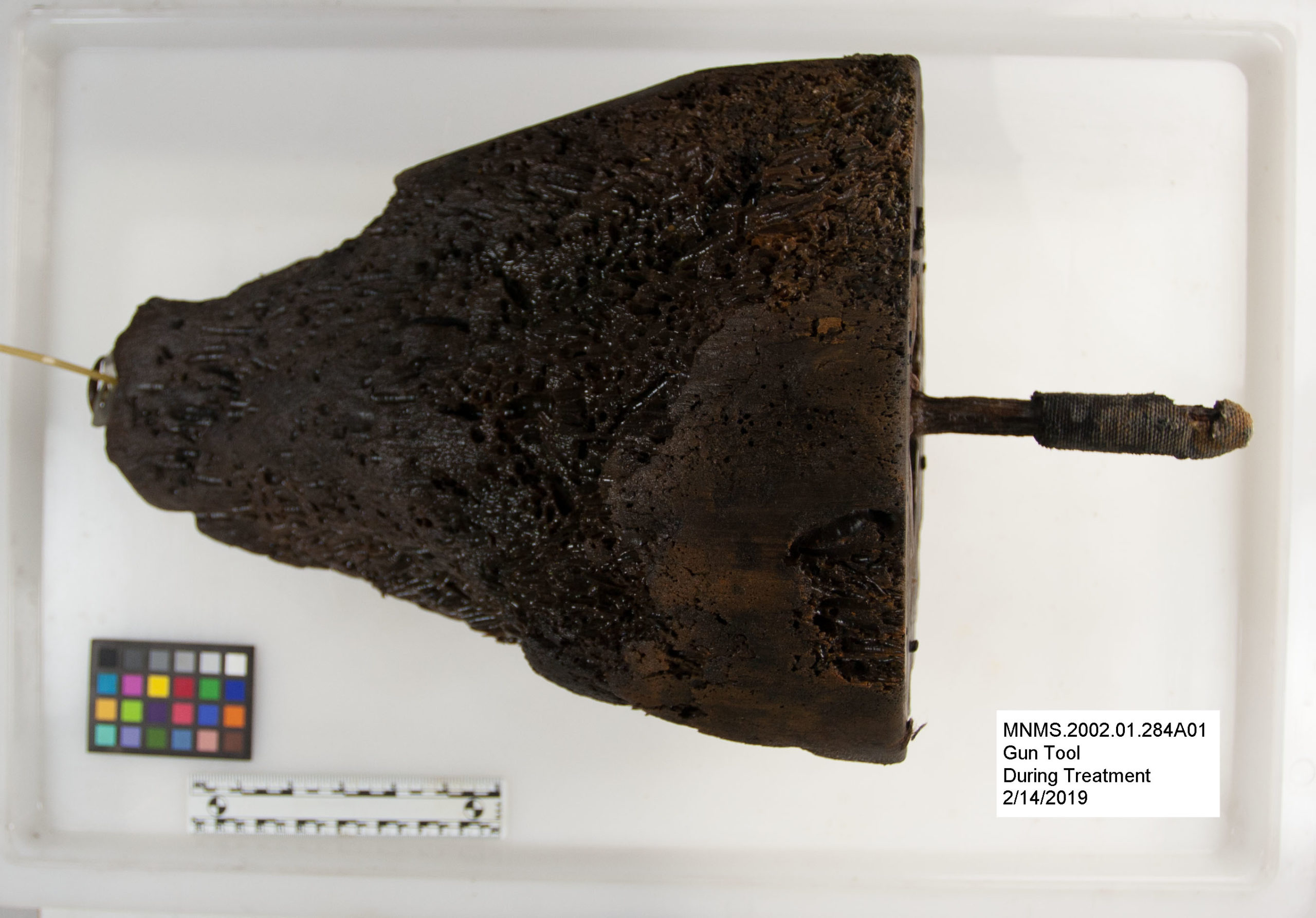 在第一部分,我讨论了枪支工具的目的。我还展示了如何构建枪支工具的方式,使我无法拆卸该工具并分别处理金属和木制零件。这意味着我将不得不在普通的保护箱外思考,并一起处理木材和金属零件。我还提到,我发现纺织品包裹在铁手柄上,我必须采取额外的步骤以确保通过治疗保存。