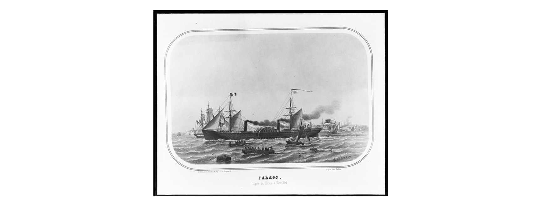 1855年1月,的每日联盟华盛顿特区的一家报纸刊登了一则公告:“阿拉戈号汽船将于两点钟在东河第七街脚下雅各布·a·韦斯特维尔特父子公司的船场启航。”由位于纽约的Westervelt & Songs建造,阿拉戈,木制船壳,侧轮蒸汽机,是一项创新的技术。在1855年,这种类型的船是一个很大的改进与它的前辈与一对摆动的发动机。[2]每日联盟继续说阿拉戈是迄今为止建造的最大的轮船之一,大约有3000吨,在速度和容量方面都是一个很好的模型。哈丽特·巴斯在给父母的信中似乎同意该报的评价。1863年3月,她写道"阿拉戈号是一艘非常大的船据说是一艘非常坚固和精致的船。”[4]阿拉戈它的目的是作为一个横跨大西洋的邮船,从1855年到1861年,它将在纽约和欧洲的港口之间运输邮件、货物和乘客。在1861年,阿拉戈还有她的姊妹船,富尔顿,在内战开始时被美国政府特许为联邦士兵的运输船。[5]