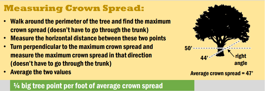 3.最后,是对树冠扩展的测量。树冠是树上地上的一切;这包括从树干伸出的树枝和叶子。扩展是树冠的宽度。下图说明了如何找到皇冠排列。对于该类别,树木每英尺平均树冠扩展可获得¼点。