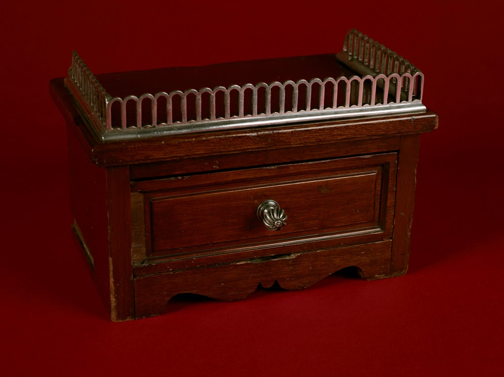 While on a search and recovery mission for those lost during the sinking, a crew member aboard the cable ship, MacKay Bennett, found this portion of a dresser top at the bottom of the Atlantic Ocean, now the resting place ofTitanic。该工件的尺寸为6-1/8英寸(高度)x 9-1/4英寸(宽度)x 6英寸(直径),并且据信它来自头等舱的一个客舱。