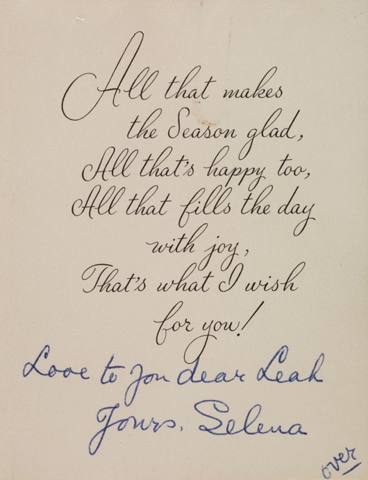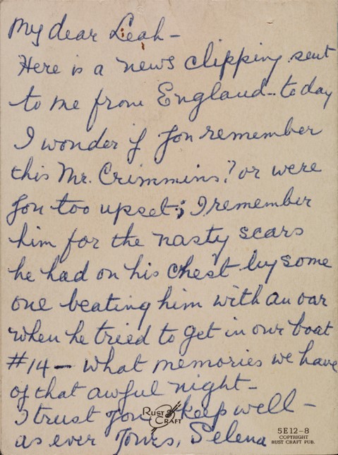 Selena Rodgers, a first-class passenger, wrote this note to Leah Aks, a third-class passenger aboardTitanic。两位妇女在她的时间里结盟喀尔巴阡山脉, the ship that came to the rescue of the survivors afloat in one of several lifeboats. Selena tells Leah about the passing of one ofTitanic’s crew members, Mr. Crimmins, in 1956. She also included his obituary from a newspaper. Artifacts and the story of Leah Aks and her son, Frank, are currently on display in the museum.