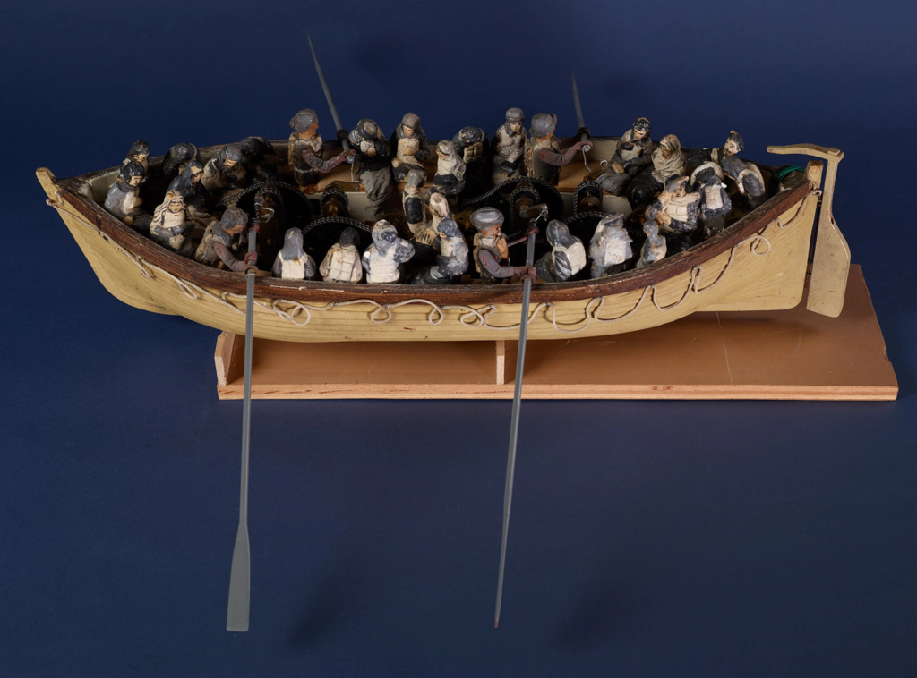 This is a movie prop that was used to replicate passengers getting into the lifeboats in the 1958 movie,难忘的一夜。The movie is based on the book written by Walter Lord in 1955 and chronicles the actual night of the sinking. This model was used to film the lifeboats leavingTitanicas it began to sink, which was staged in a swimming pool! This model lifeboat is made of electrified fiberglass and wood, complete with survivors – mainly female – wearing lifejackets and four oarsmen activated electrically by four separate motors with gear and chain drive. The model is finished in weathered white and natural wood.