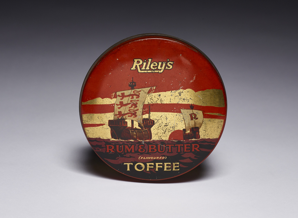 贴在本着万圣节的精神,我在收藏中寻找一些独特的东西来分享。我发现了一个盖子上有两只船的小糖果罐。正面的名字写着莱利的朗姆酒奶油太妃糖,听起来很有趣,所以我开始研究。