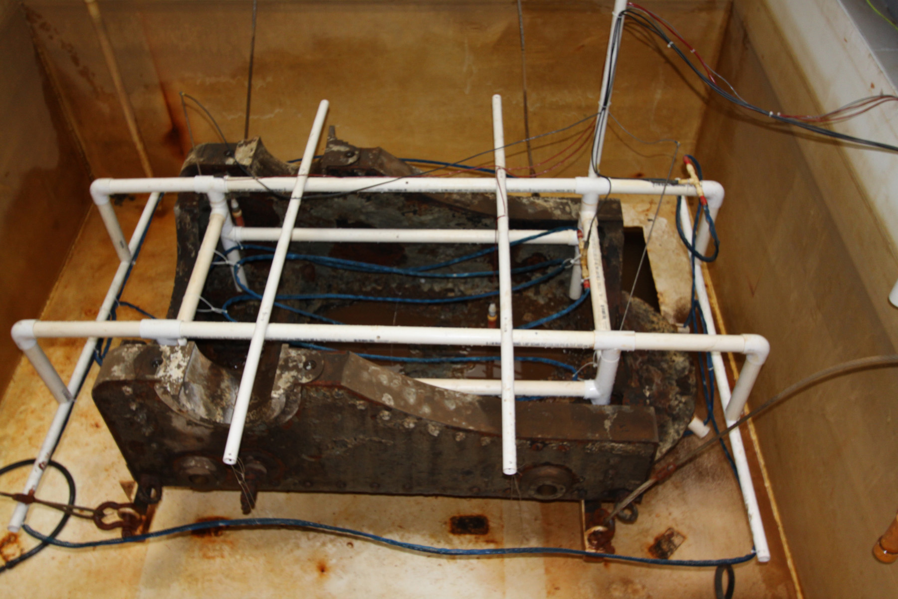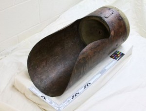 A shot ladle was recovered under the wooden chest inMonitor在2002年的炮塔。铜scoo组成p nailed to a wooden head, it allowed the gunners to perfectly load/unload the Dahlgren guns.