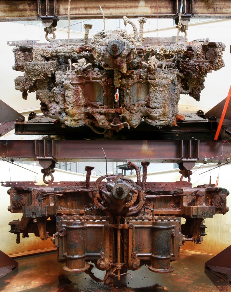 It was Friday afternoon and Conservator Elsa Sangouard did not say a word; she didn’t have to say anything. Her smile told the whole story. Elsa and Gary Paden, the Objects Handler for the USSMonitorConservation Project, had just successfully removed a beautiful and shiny copper alloy tallow cup fromMonitor’s 25-ton steam engine when I walked into the engine treatment tank. They held the multi-component artifact with pride and examined it closely. It had the appearance of something Dr. Seuss would have invented. Two valve handles of different sizes extended from the smooth, round tallow reservoirs. A smaller drain spigot with a stout nozzle extended from one of the reservoirs. It looked ornate and stout, fantastical and practical. Engineers heated tallow or pig fat in these devices. The liquid fat would then drip into the steam engine’s valve chests, providing critical lubrication. Surprisingly, Elsa was able to turn one of the valve handles as if it the object was new. Smiles grew wider on their sweaty and sediment-covered faces.
