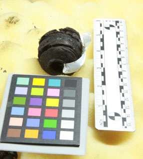 Last week Will and Eric were preparing to photograph the steam chest fromMonitor’s port Worthington Pump. This component houses the slide valve which fed steam from the boilers to drive the pump’s steam piston. Noticing that the valve rod packing seal fitting appeared to have loosened up during treatment, they were able to remove it intact and discovered that the fibrous packing material was still inside. The organic packing material, which resembles a tightly twisted rope, was wound around the wrought iron valve rod and packed tightly into a packing chamber. It may have been treated with lead or some type of natural oil or tallow to improve the sealing properties. When the pump was functioning on theMonitor, this material would have kept the steam sealed inside where it could do the most work, and prevented waste of valuable boiler pressure. This find is exciting! Although we know there were a number of packing seals used on theMonitor, this is the first one we have found intact! Look for more on the packing material soon!