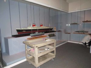 In the second room, seen in the picture above, the engineering of these mighty ships was discussed and two of our artifacts were included. The first is the piece hanging from the ceiling, a towing tank model of SS United States. This model was tested in the U.S. Navy’s David W. Taylor Model Basin at Bethesda, Maryland in 1946. The other piece is the cream-colored half model on the wall to the right. It doesn’t look like much in this photo, but it is a 21′ plating model for SS United States, made in 1949.