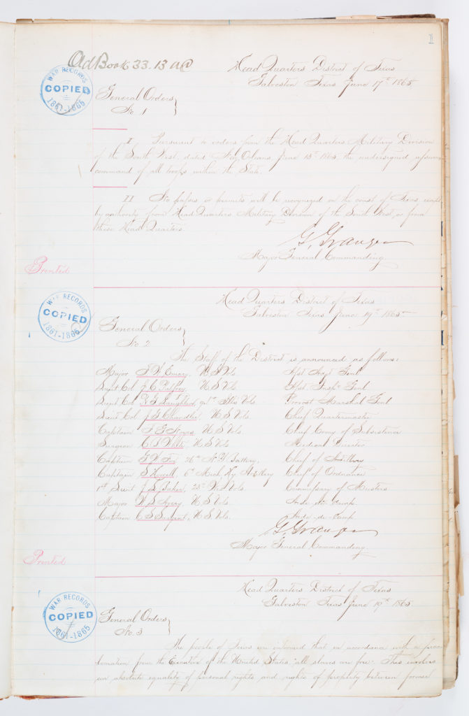 1865年6月19日,戈登·格兰杰少将率领的联邦军队抵达德克萨斯州加尔维斯顿,向居住在这个位于屏障岛上的城市及其周围的被奴役人口下达了一项意外但受欢迎的命令。第3号一般订单规定如下: