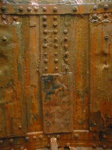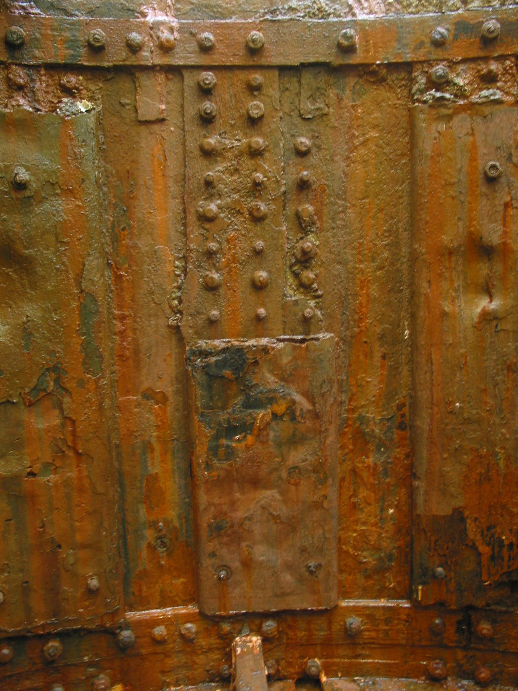 Inside theMonitor’s turret there are a series of thin wrought iron plates that covered the rows of nuts and bolts that held together the turret armor. The purpose of these plates was to prevent the nuts from breaking off of the bolts and flying around inside the turret when the armor took a hard hit during battle. The plates, known as nut guards, were about 1/8thinch thick rolled iron sheets, a couple of feet wide and several feet long, with the sides curved like a deep cookie sheet. Each nut guard was held in place by a pair of bolts near the top and bottom edges of the plate. The spaces behind the nut guards filled up with muddy sediment while theMonitorwas sitting on the bottom of the ocean.