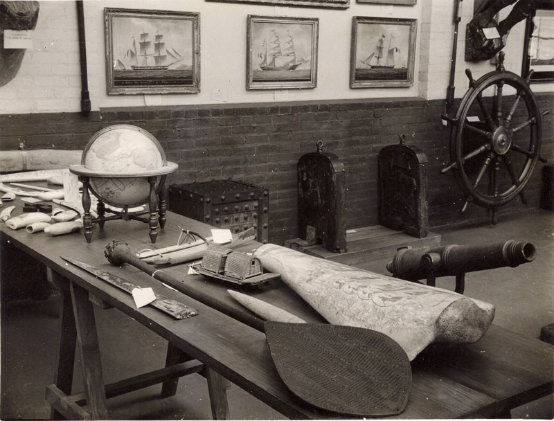 In our early days, we often simply placed objects all over tables to show off as much of the collection as possible. Of course this left them easily exposed to damage and theft, so we no longer display them like this, but it still looks neat. This image is from 1934 and features a small portion of our scrimshaw collection. The finest piece is that large panbone next to the paddle from 1857/1858 depicting the Civic Heroes of the American Revolution and the Washington Monument at Richmond. It was made by Nathaniel Sylvester Finney, a veteran whaleman.