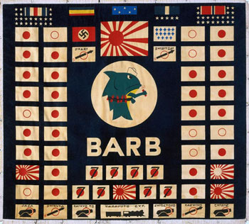 在战旗的顶部显著地出现了值得注意的引用和奖章的图标,这是由倒钩人员和船员。为感谢您的服务,本演示文稿副本倒钩1945年末,福基和船员将这面战旗交给了中尉吉姆·韦伯斯特。韦伯斯特在第11和第12次战争巡逻期间担任执行官(XO)下的扶基,并最终从Barb转移到接管另一艘潜艇。在第11次战争巡逻期间,韦伯斯特在袭击停泊在被占领中国南关港的日本帝国船只中发挥了重要作用。那次行动之后,福基被指定佩戴国会荣誉勋章代表倒钩表彰他们在第十一次战争巡逻时的集体英勇行为。因此,这个非凡的荣誉奖章的绶带出现在顶部的中心倒钩战斗旗帜。