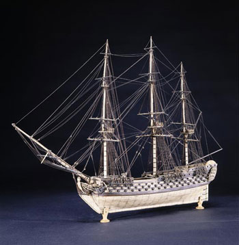 在拿破仑战争期间,成千上万的法国和西班牙水手在英国监狱里呆了数年。这些人中的许多人放弃了平时的珠宝商、木工和工匠的工作,被征召加入了本国的海军。在监禁期间,他们利用技能消磨了囚禁的时间。最受欢迎的科目是船模。这些匿名的囚犯没有商量的计划,只有最粗糙的材料。他们用牛骨做船壳和桅杆,用富有同情心的妇女的头发做帆索。虽然结果在准确性方面还有待改进,但最好的战俘模型确实是令人心酸的艺术品。