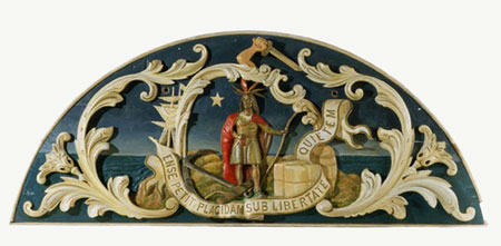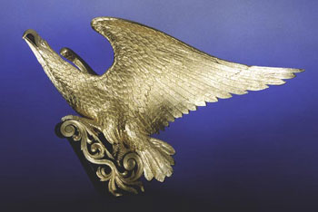 随着汽船的船茎越来越不倾斜,船身上的头像也就消失了。取而代之的是领航室的鹰、严峻的装饰,特别是桨箱,为雕刻者提供了新的机会来实践他们的艺术。桨盒装饰品,如这装饰结构覆盖桨轮。