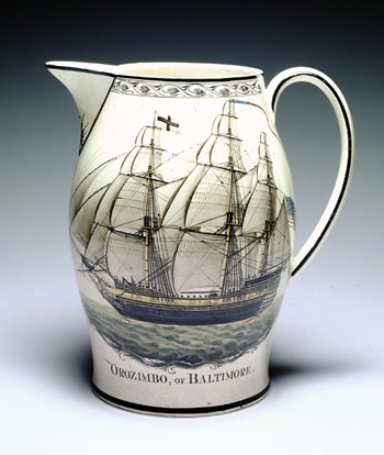 奶油锅投手是为在利物浦呼吁的许多美国船舶的所有者和船长制造的。通常图像是传输打印。然而,在这种情况下,巴尔的摩的奥罗佐米的图像在油中被涂上了。
