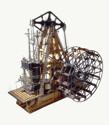 由于其稳定的摇摆作用,这种菱形光束被称为“行走光束”,它在中心枢轴,将发动机单个大活塞的垂直运动传递到驱动桨轮的轴上。梁和支撑结构最初是用木头建造的,后来用钢铁建造。